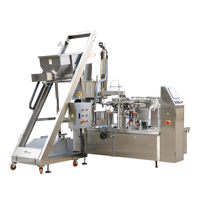 2.旋轉全自動給袋式真空包裝機由兩種分離的旋轉式機體組成(分別為充填系統(tǒng)和真空系統(tǒng)).充填系統(tǒng)為間歇式旋轉運轉,真空系統(tǒng)為連續(xù)式旋轉運動。