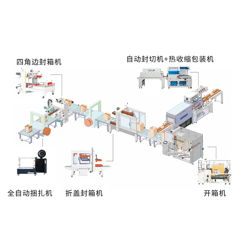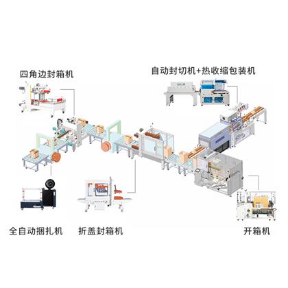 全自動(dòng)封切收縮機(jī)+動(dòng)力滾筒+開箱機(jī)+折蓋封箱機(jī)+四角邊封箱機(jī)+全自動(dòng)打包機(jī)(可任意定制)